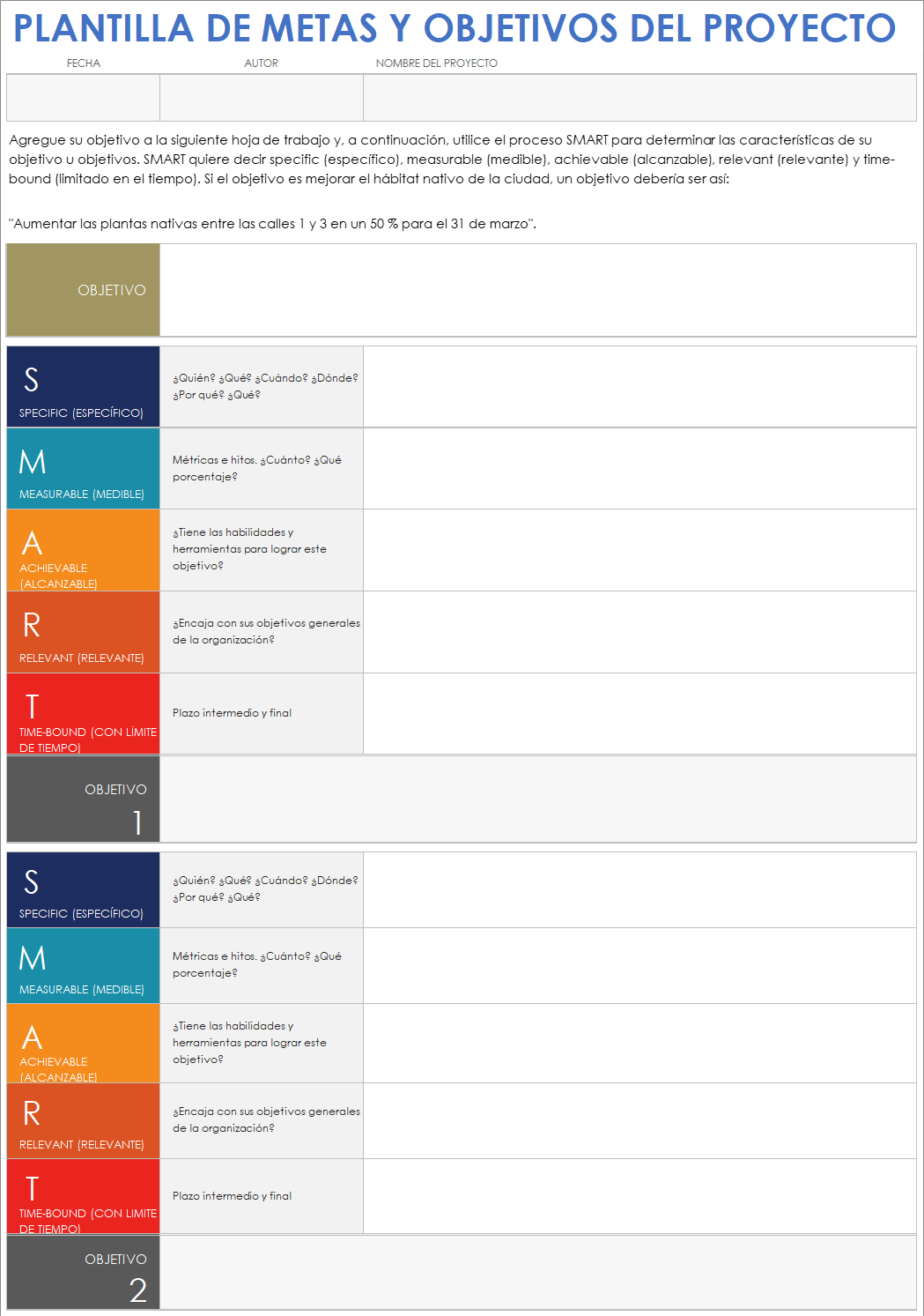 Utilice esta plantilla gratuita e imprimible para aprender a desglosar las metas de un proyecto en objetivos individuales con el marco SMART. Escriba la meta principal en la parte superior de la hoja de cálculo y, luego, siga el proceso SMART para crear uno o más objetivos específicos que le permitan alcanzar esa meta.