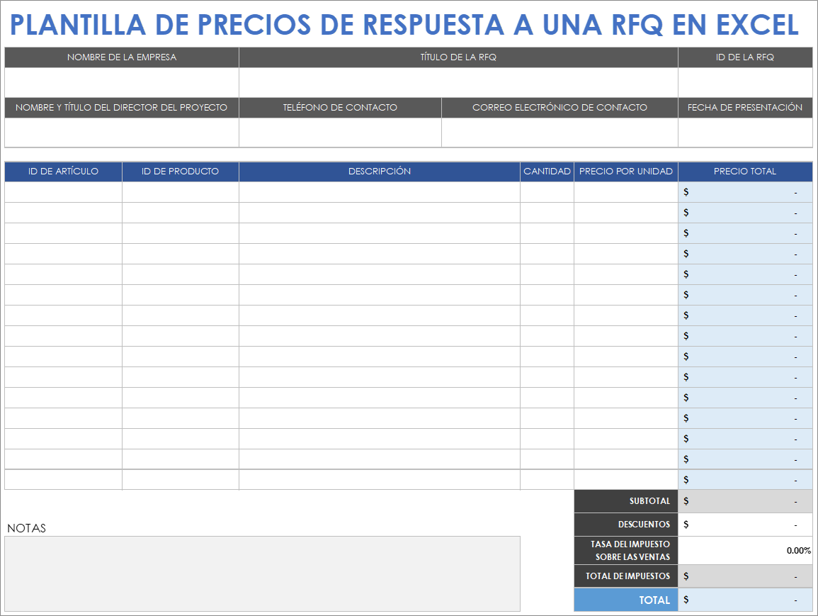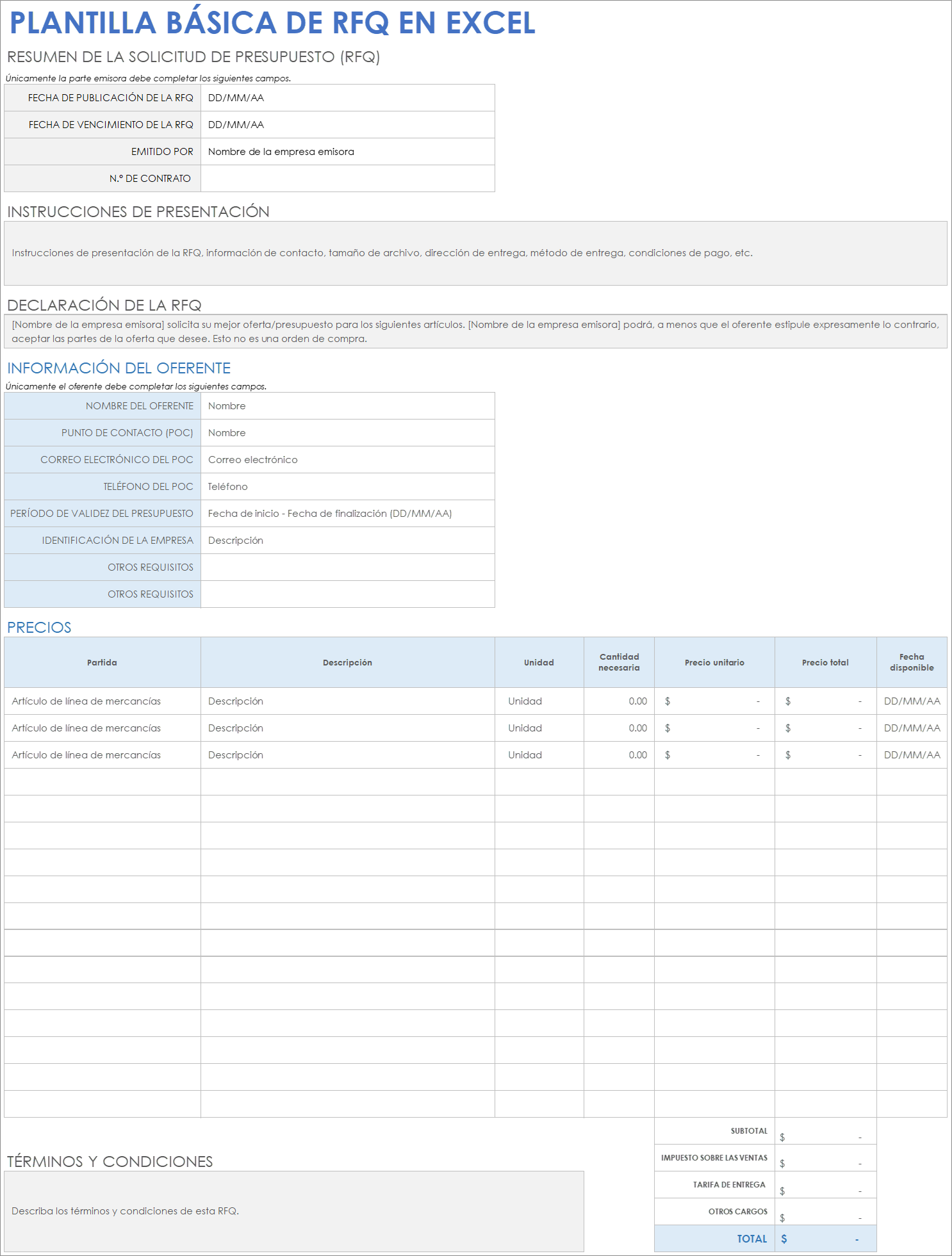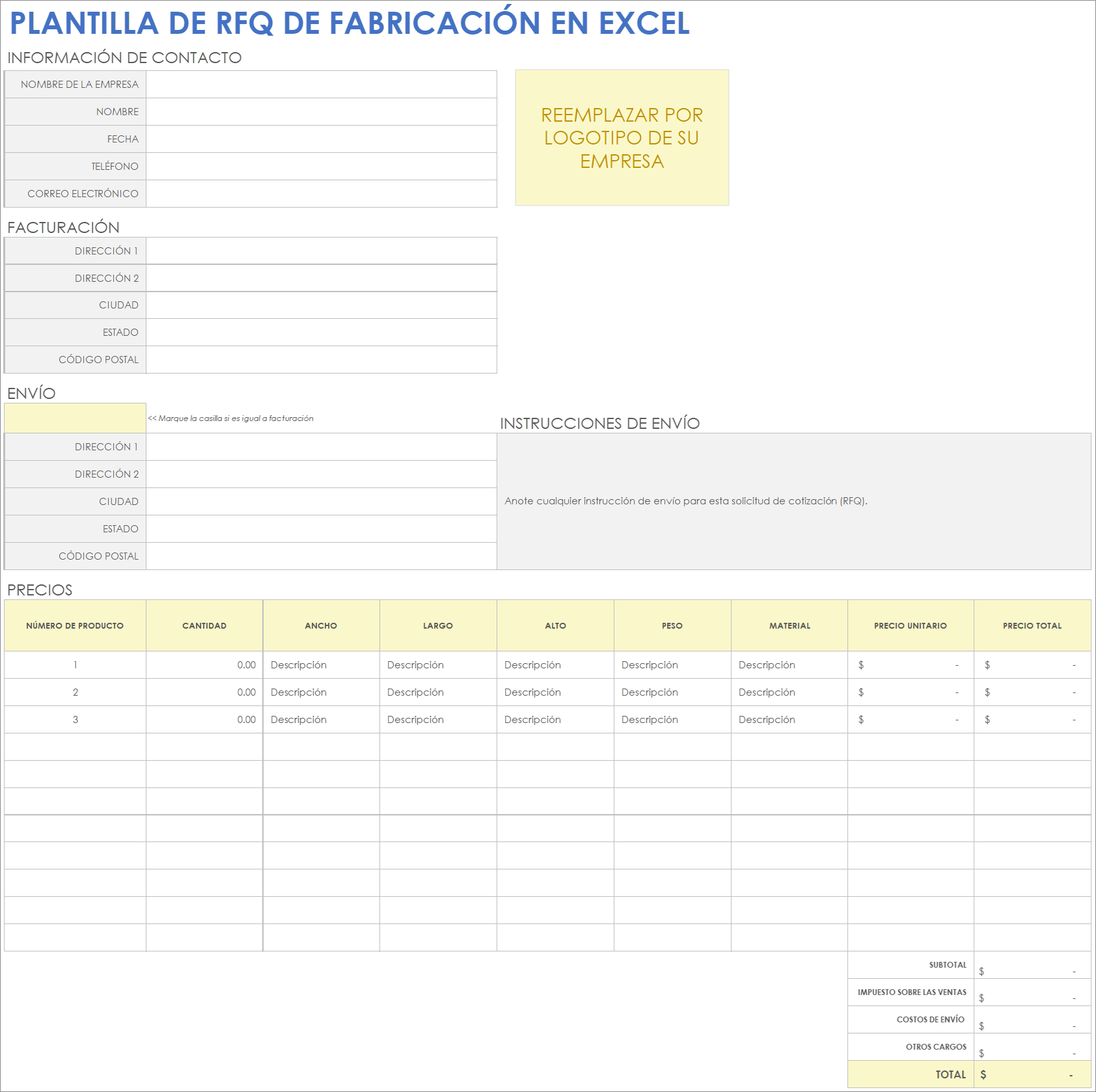 Descargar Plantilla de precios de respuesta a una RFQ para Excel