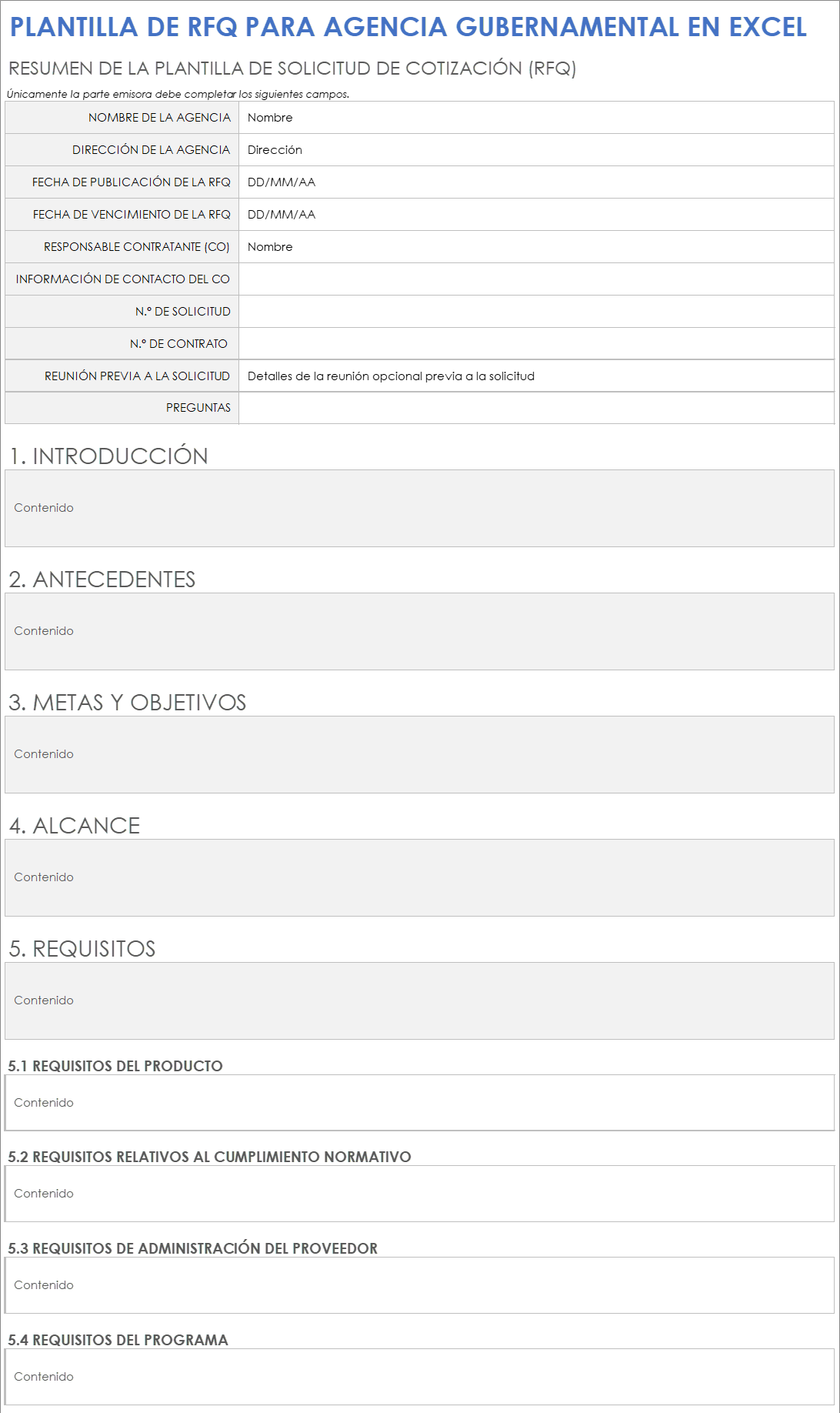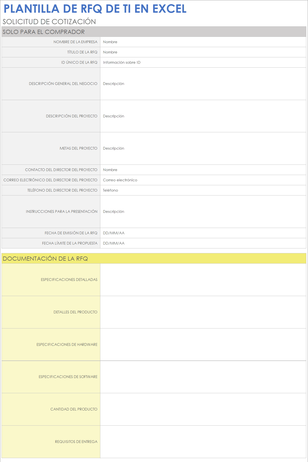 Cuándo usar esta plantilla: Utilice esta plantilla de solicitud de cotización de fabricación para solicitar precios de productos a los proveedores fabricantes. Esta plantilla funciona bien cuando se desarrolla un producto nuevo, se reemplaza un producto, se obtienen componentes, se escala la capacidad o se produce un prototipo.
