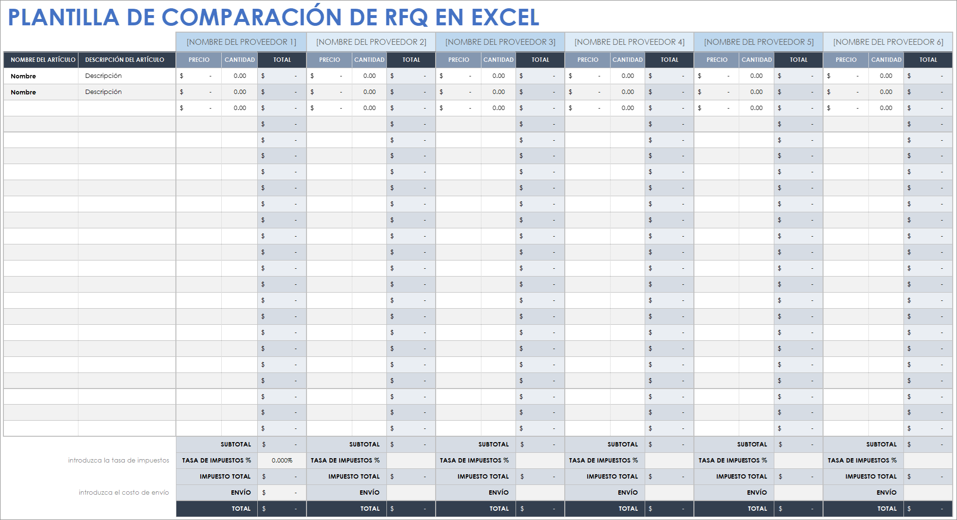Cuándo usar esta plantilla: Utilice esta plantilla de comparación de solicitudes de cotización para organizar y comparar los precios, las cantidades y los totales de varios proveedores en un solo lugar.