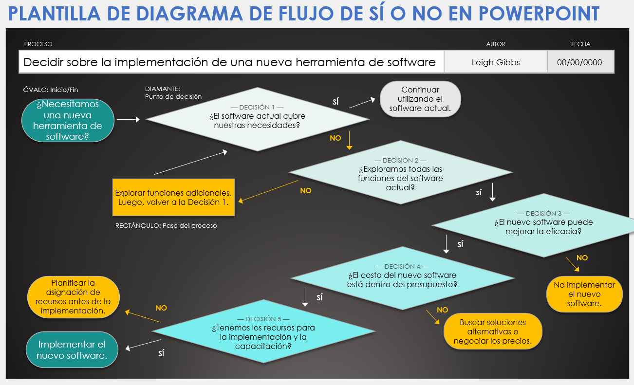 Características destacadas de la plantilla: Esta plantilla cuenta con un diseño claro y de paso a paso que se ramifica en función de las respuestas afirmativas o negativas. Esto facilita la toma de una decisión clara al representar las consecuencias de cada opción posible.