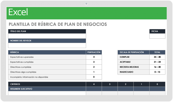 Una vez que complete su plan de negocios, utilice esta plantilla de matriz del plan de negocios para evaluar y calificar cada componente del plan. Esta matriz ayuda a identificar los elementos del plan que cumplen o exceden los requisitos, y a identificar las áreas en las que necesita mejorar o profundizar. Esta plantilla es una herramienta valiosísima para garantizar que, en su plan de negocios, se definan con claridad las metas, los objetivos y el plan de acción, con el fin de obtener la aceptación de posibles inversores, partes interesadas y socios.