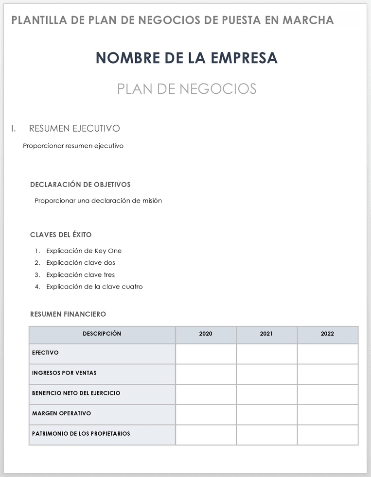 Esta plantilla simple de plan de negocios incluye todos los elementos de un plan de negocios tradicional para que pueda crear el suyo propio, y tiene espacio para agregar información financiera para las empresas emergentes que buscan financiamiento. Puede utilizar y personalizar esta plantilla simple de plan de negocios para que se adapte a las necesidades de organizaciones de cualquier tamaño.