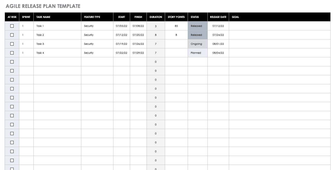 Esboza todas tus tareas del proyecto, asigna tareas a un sprint específico y determina las duraciones aproximadas de las tareas con esta plantilla de plan de lanzamiento ágil. Gestiona cada tarea desde la fecha de inicio hasta la fecha de finalización, y maneja todos los cambios de cronograma y recursos con facilidad con una visión general visual y fácil de ajustar de tu proyecto ágil. Actualiza el estado de las tareas para seguir cómo avanza el proyecto y asegurarte de que tu proyecto se mantenga dentro del cronograma predeterminado.